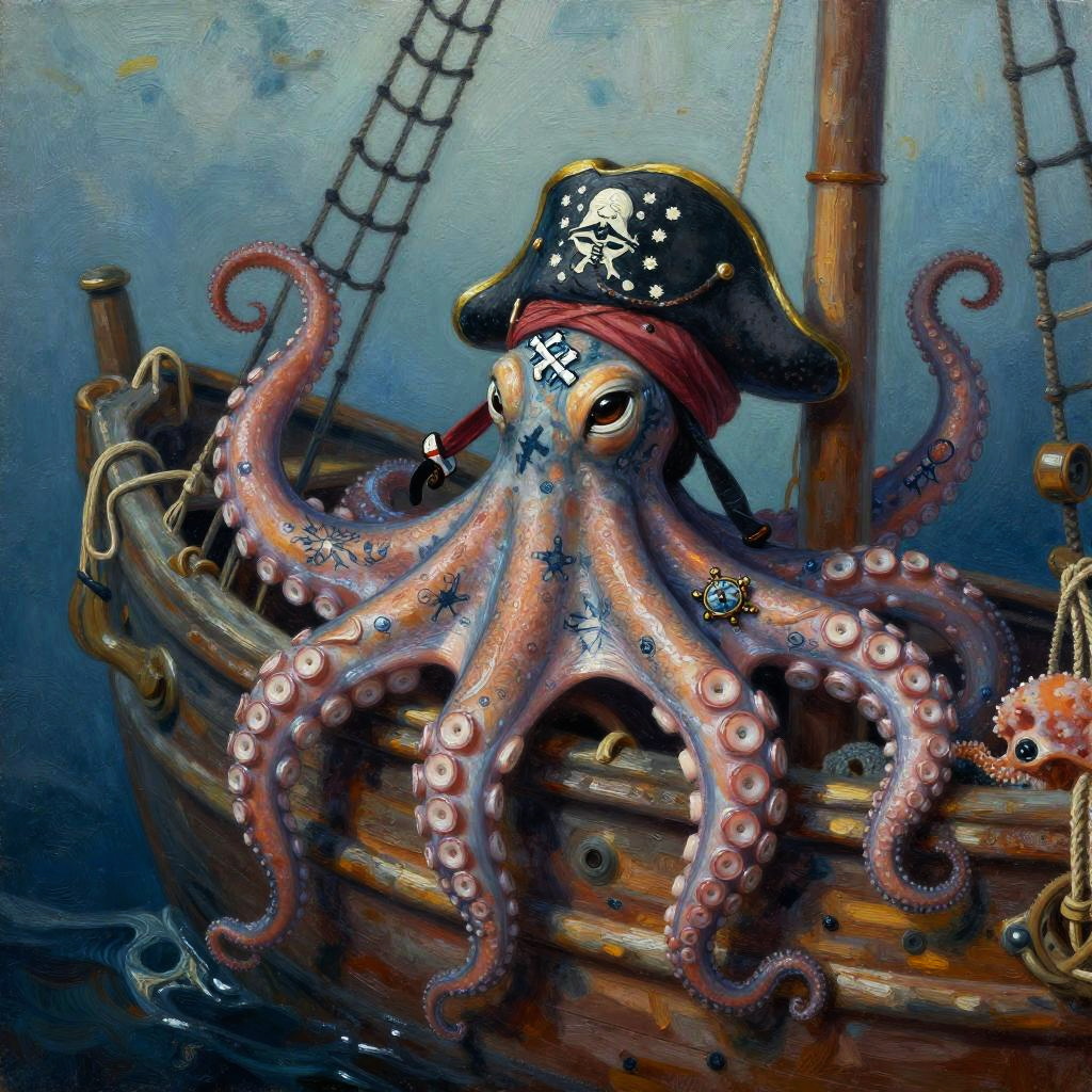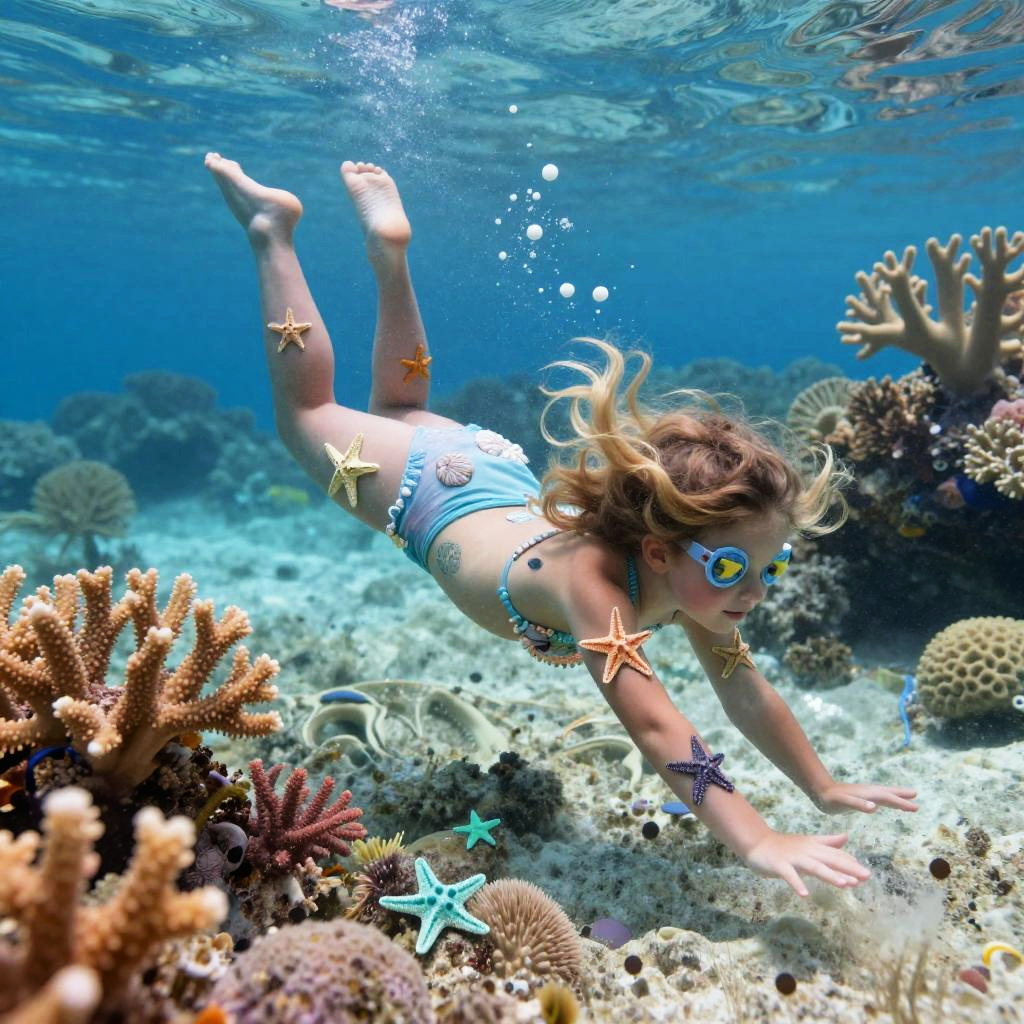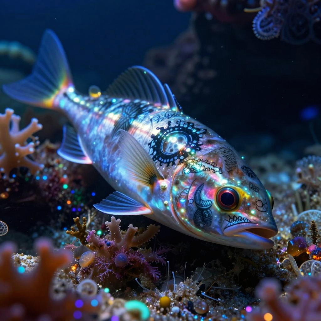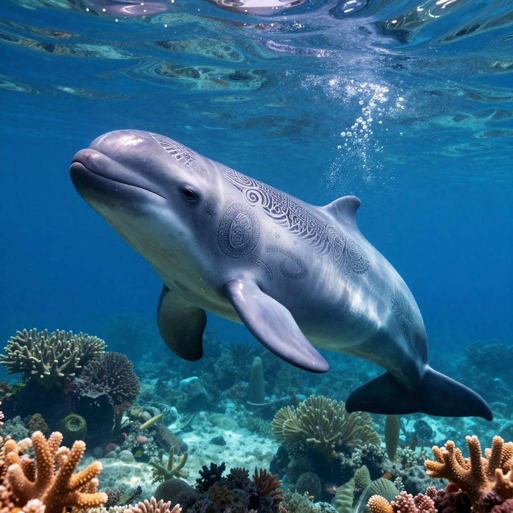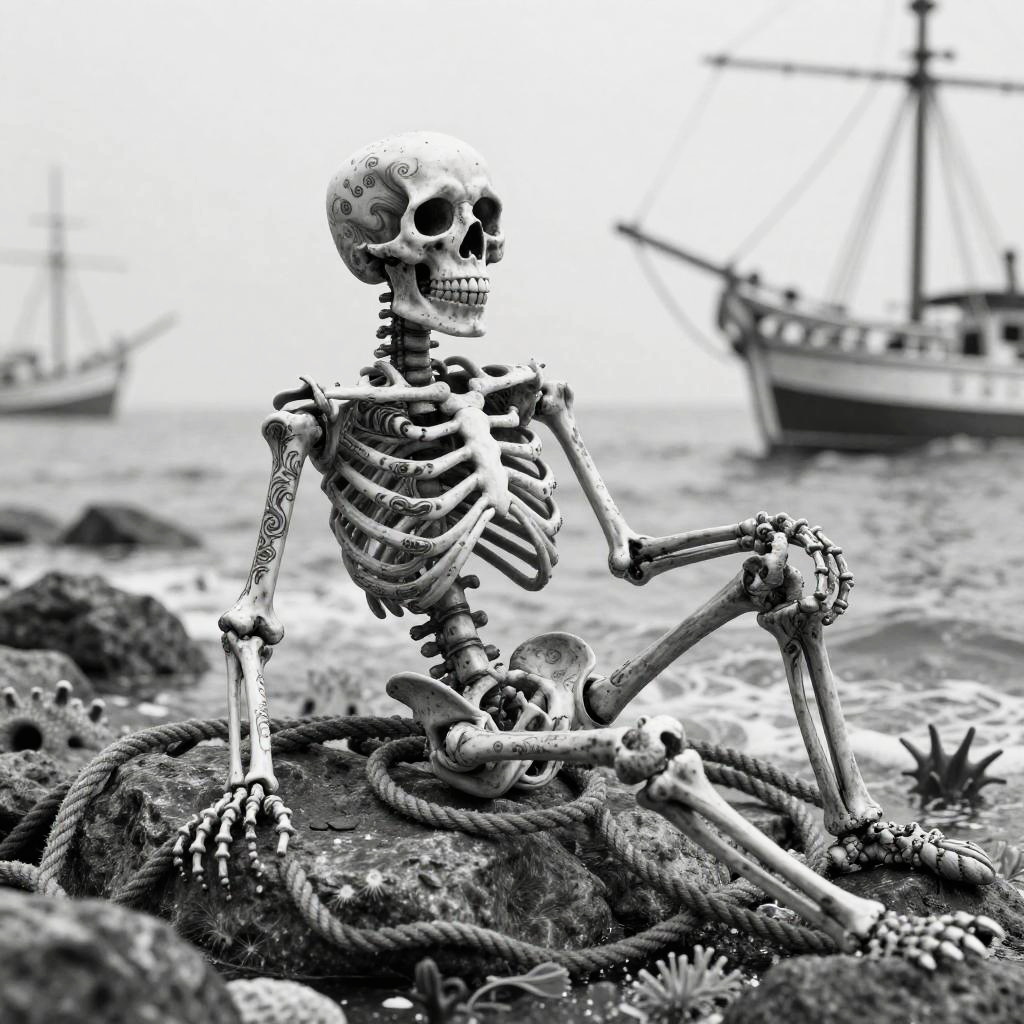 An ancient mermaid skeleton adorned with pearl jewelry, resting among sunken pirate treasures on the ocean floor, dramatic underwater digital art, macro lens capturing fine tattoo details, emphasis on sea-life connection.