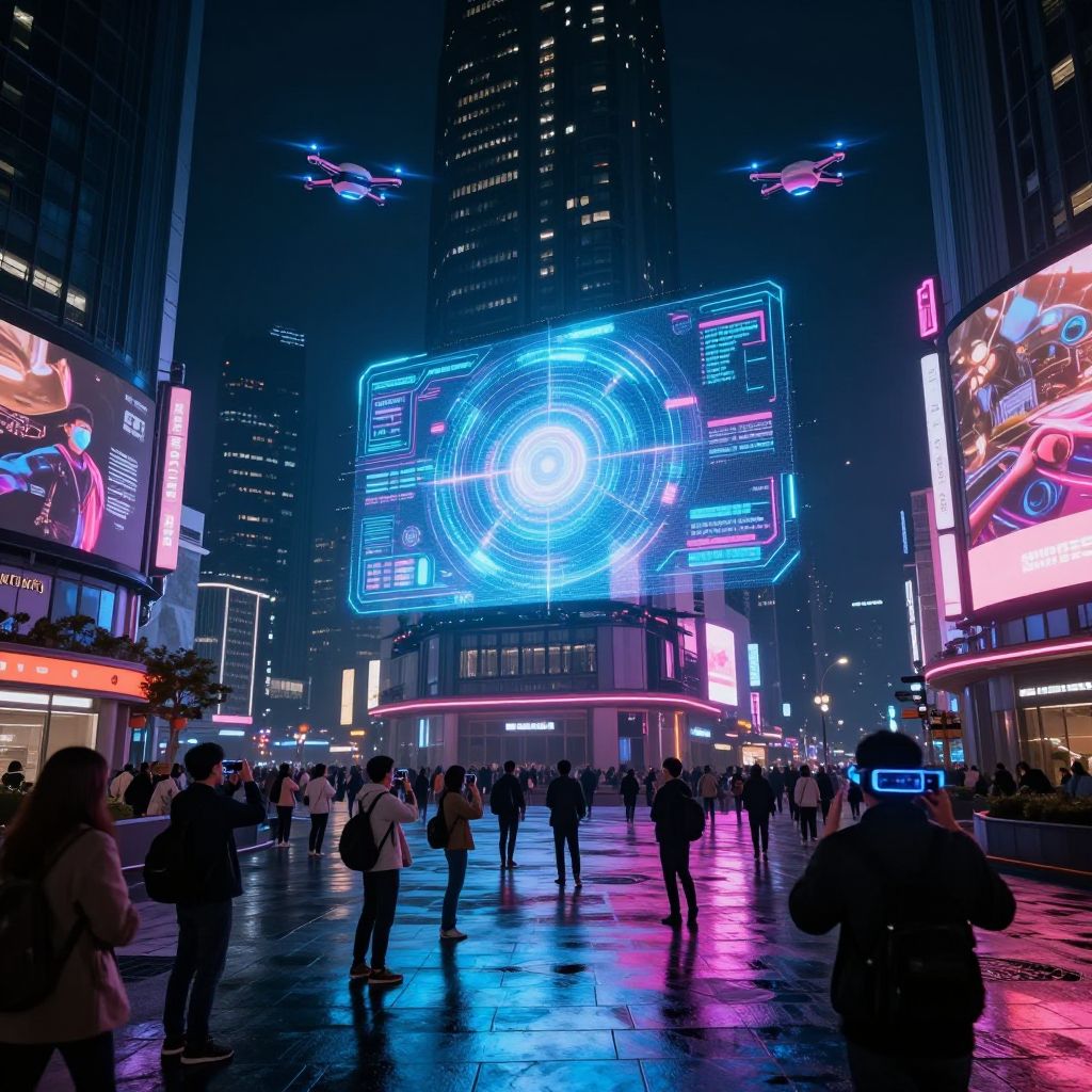 An AI flag fluttering over a high-tech metropolis, composed of holographic streams and pixelated code textures, with drones flying in the background, sunset lighting creating warm reflections on metallic surfaces, intricate detail, sci-fi atmosphere