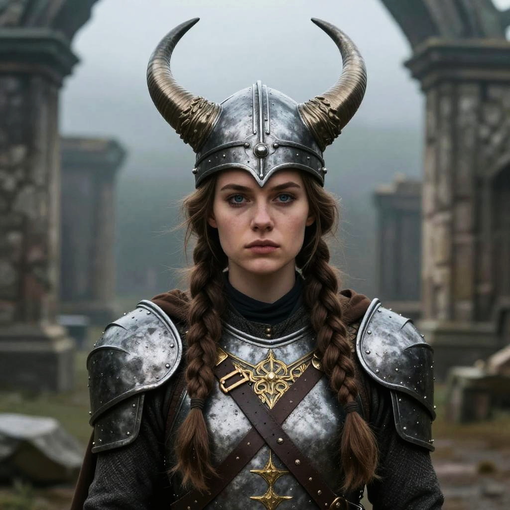 Photograph-style digital artwork of a young woman with braided hair, wearing a medieval chainmail tunic, standing in a misty, ancient stone