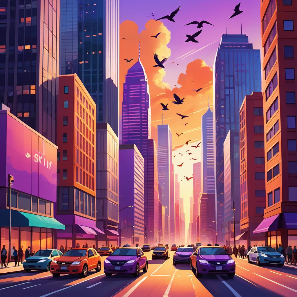 A bustling city street at sunset with tall skyscrapers on both sides, warm orange and purple sky with scattered clouds, birds flying, cars parked along the street, soft cinematic lighting casting long shadows, vibrant urban atmosphere, stylized illustration with sharp contrasts and warm color tones