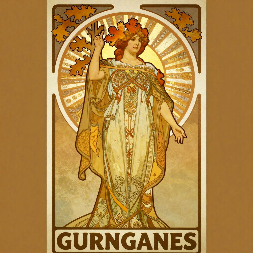 Germania personification in an Art Nouveau poster style, elegant flowing robes with intricate patterns inspired by German folklore, framed by stylized oak branches and rays of golden light, warm earthy color palette, vintage propaganda vibe with modern digital art textures.