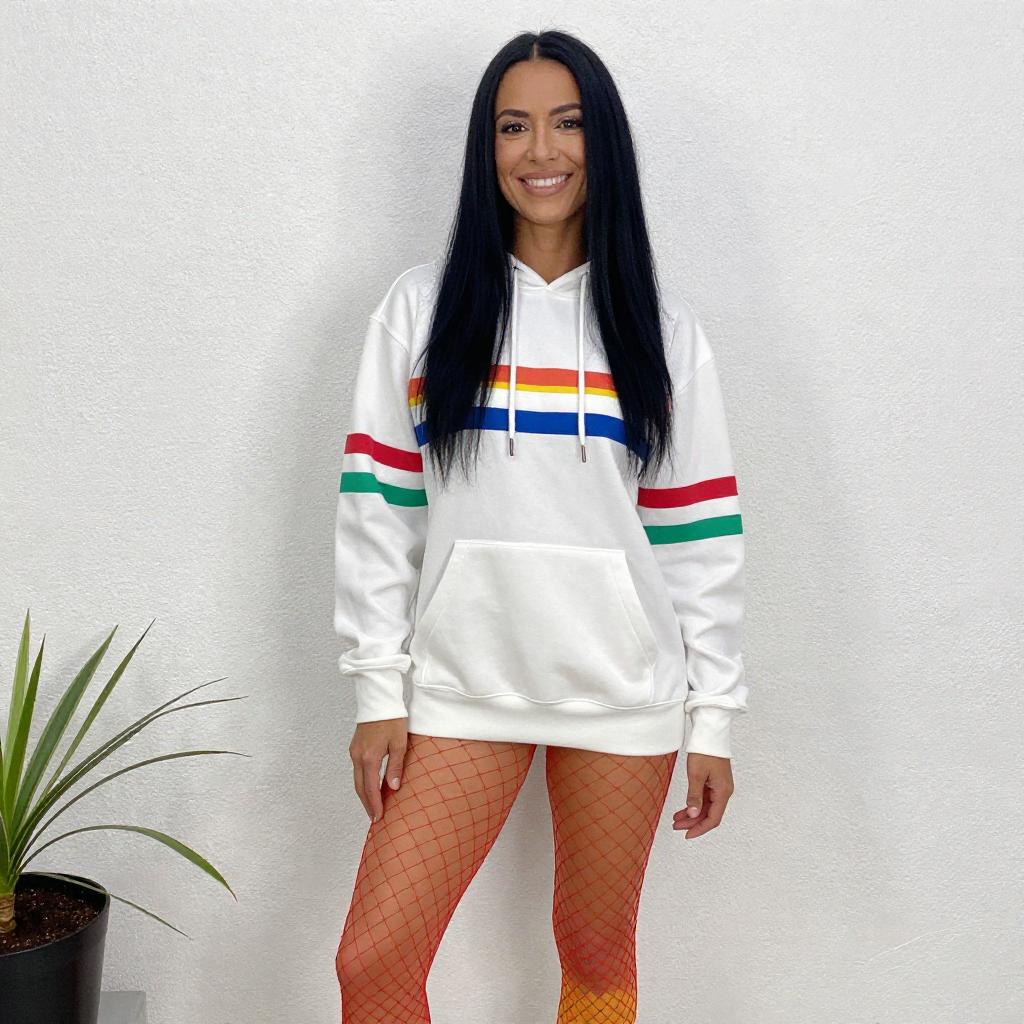 Photograph of a smiling woman with long black hair, wearing a white hoodie with colorful stripes, red fishnet stockings, and yellow-orange leggings. She stands against a white, ured wall with a green plant and black pot on the left.