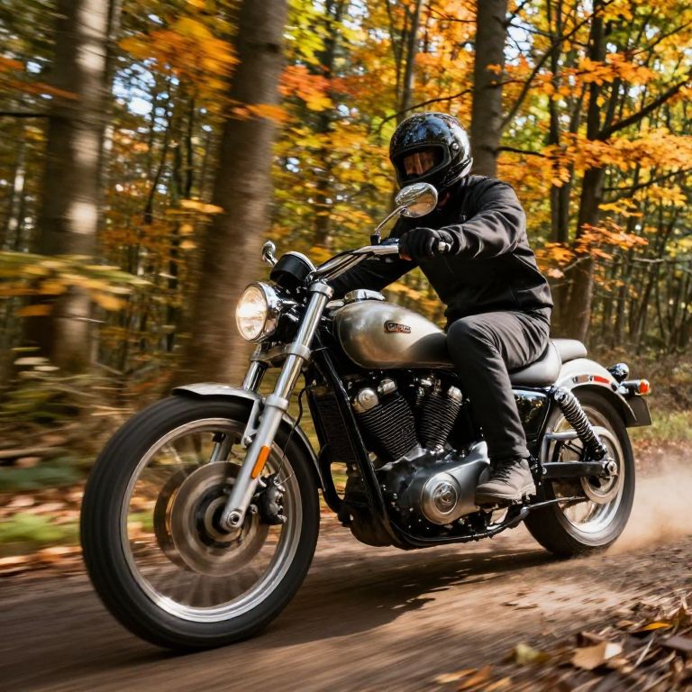 Dutch's classic motorcycle riding through dense forest trails, vibrant autumn leaves swirling in the wind, detailed metallic bike parts gleaming under the sun, dynamic action shot capturing speed and freedom in nature.