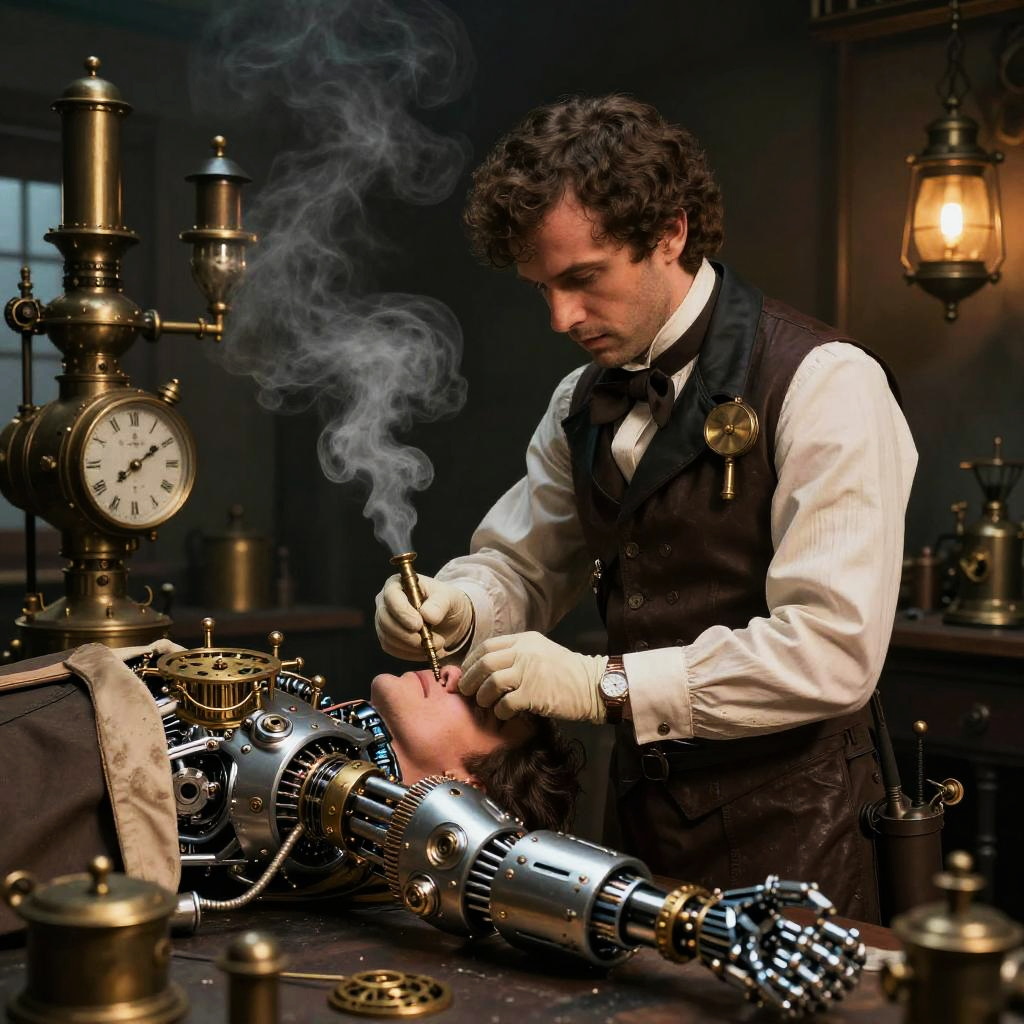Steampunk medic tending to a patient with cybernetic implants in a cluttered workshop, blending mechanical prosthetics with Victorian fashion, steam vents puffing softly, intricate clockwork details on medical instruments, moody and detailed environment.