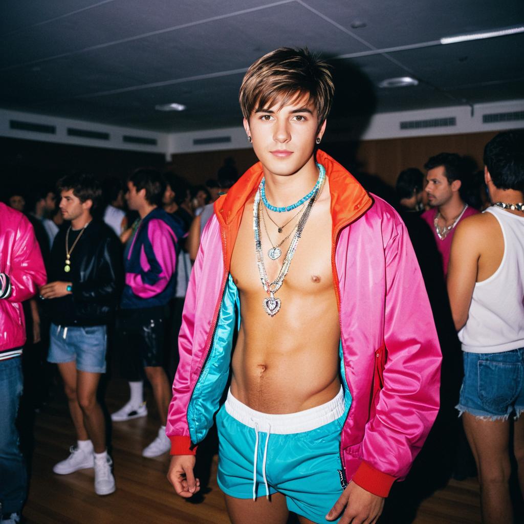 Portrait of a young man with brown hair smiling at the camera, wearing multiple black bead necklaces and silver jewelry including earrings. The background is blurred with partygoers and colorful lights, creating a vibrant night event atmosphere. The subject is shirtless, emphasizing his accessories and relaxed expression.