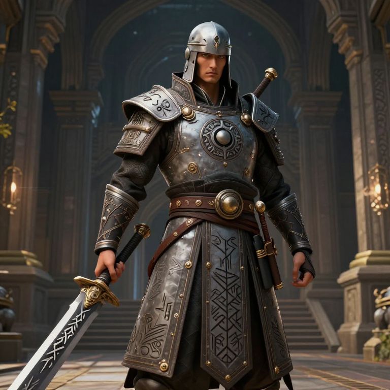 CGI image of a muscular, armored knight with a silver helmet, intricate armor, and a patterned sword, standing in a dimly lit,