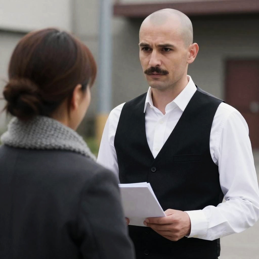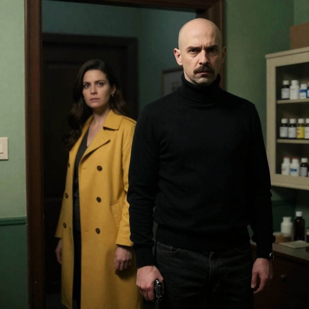 Man with balding head, mustache, dark coat, black turtleneck, wearing 12 red explosive devices on chest, standing in front of chain-link fence. Background includes metal gates and signs. Man's expression is serious, holding coat open.