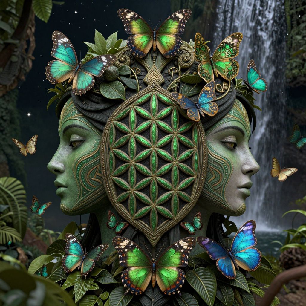 The image presents a highly detailed and intricate scene featuring two faces, one of a green man and one of a green woman, set against a dark, starry background. The faces are adorned with elaborate patterns and textures, reminiscent of sacred geometry, with the seed of life symbol prominently displayed. Surrounding the faces are numerous butterflies, each with intricate designs and vibrant colors, including shades of green, blue, and gold. The butterflies are positioned in various orientations, some appearing to be in flight, while others rest on the faces or the surrounding foliage. The scene is set in a lush, green environment with dense foliage and a waterfall in the background, adding a sense of tranquility and connection to nature. The overall composition is symmetrical, with the faces and butterflies arranged in a balanced manner, creating a harmonious and visually striking image. The use of the Unreal Engine and Octane render suggests a high level of realism and detail, making the scene appear almost photorealistic. The interplay of colors, textures, and shapes creates a rich and immersive visual experience, capturing the essence of the sacred and the natural world.