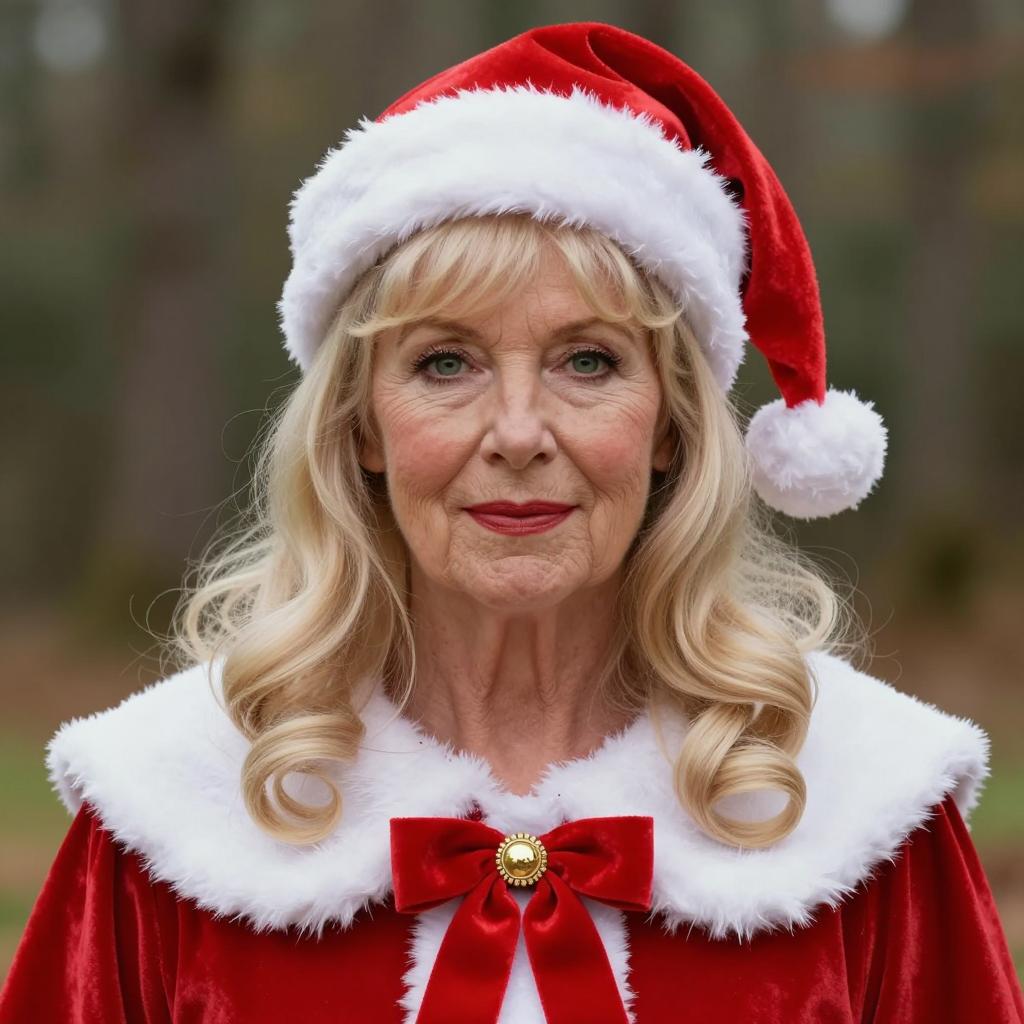 Mrs claus costume woman, photorealistic, christmas-themed, woman with blonde hair, wearing santa hat, red and white christmas sweater, decorative arm patches, standing in front of decorated christmas tree, warm candlelight in background, holiday gifts and decorations, soft lighting, festive atmosphere, cozy and warm, detailed ures, holiday spirit, realistic colors, standing pose, slight smile, looking at camera