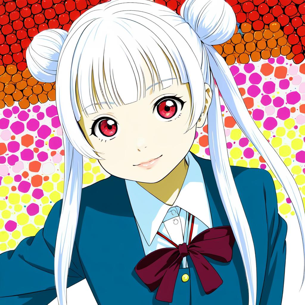 Arashi chisato, love live!, 1girl, red eyes, white hair, long hair, double bun, blunt bangs, twintails, yuigaoka school uniform, single sidelock, by artist kimmy77, anime