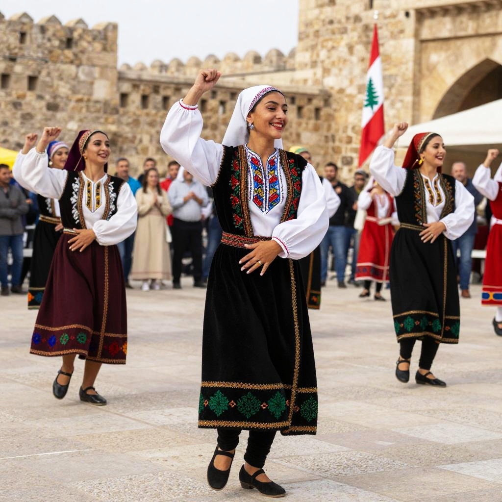 Lebanese folk dancers in traditional costumes performing a lively dabke dance in an open plaza, vibrant embroidered dresses, joyful expressions, dynamic motion captured, ancient stone walls and flags waving in background, festive cultural celebration.