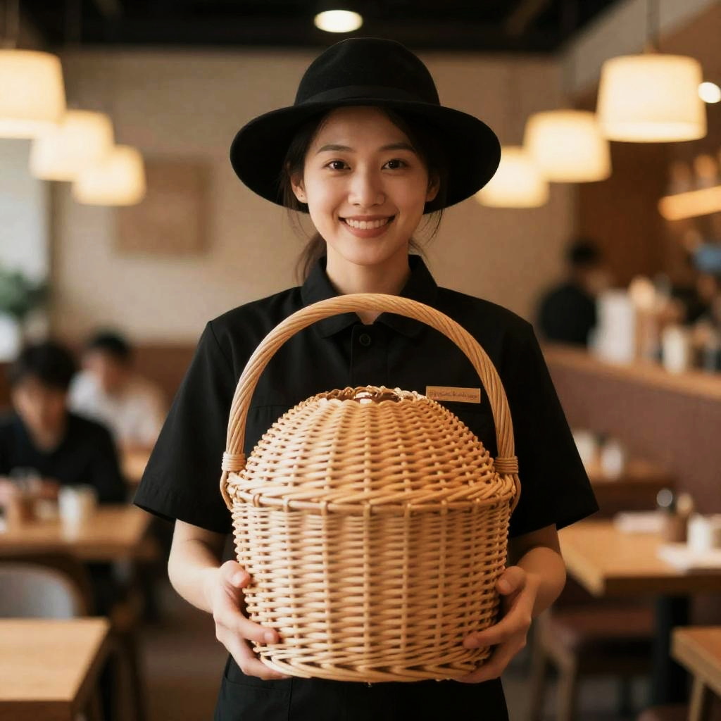 Woman in black hat and uniform, smiling, holding wicker basket with rounded top, inside warmly lit restaurant, background blurred.