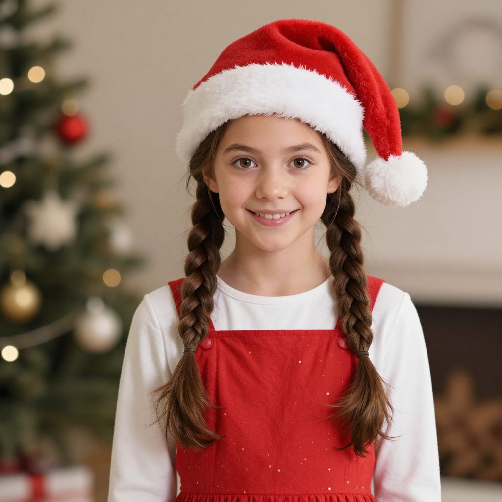 Photograph of a young girl with brown braided hair, wearing a Santa hat and red dress over a white shirt, smiling in front of a Christmas