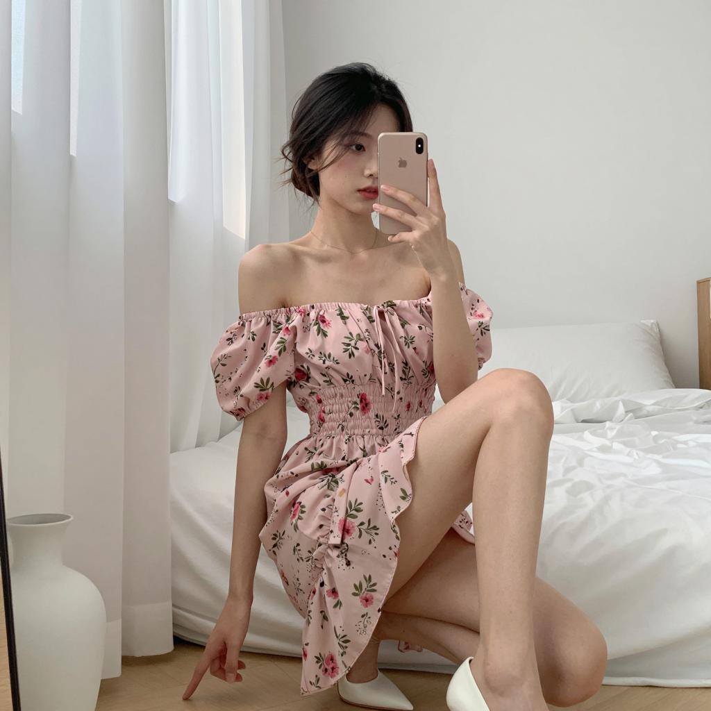 Woman taking a mirror selfie, wearing a white, off-the-shoulder, puffed-sleeve, ribbed mini dress with a bow at the center and ruffled hem. Long dark hair, light skin. Holding a pink smartphone with a white case in her right hand. Necklace with multiple thin chains around her neck. Background: white bed, wooden dresser. Reflection in a vertical mirror on the left. Right leg slightly bent. Dress reveals a cleavage outline. Soft, natural light.