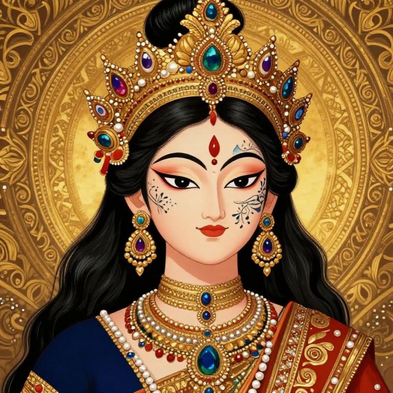 This striking illustration features a regal figure adorned with intricate jewelry and elaborate facial paint, set against a background of golden patterns. The rich colors and detailed embellishments create a captivating and ethereal atmosphere, showcasing a blend of cultural and artistic elements.
