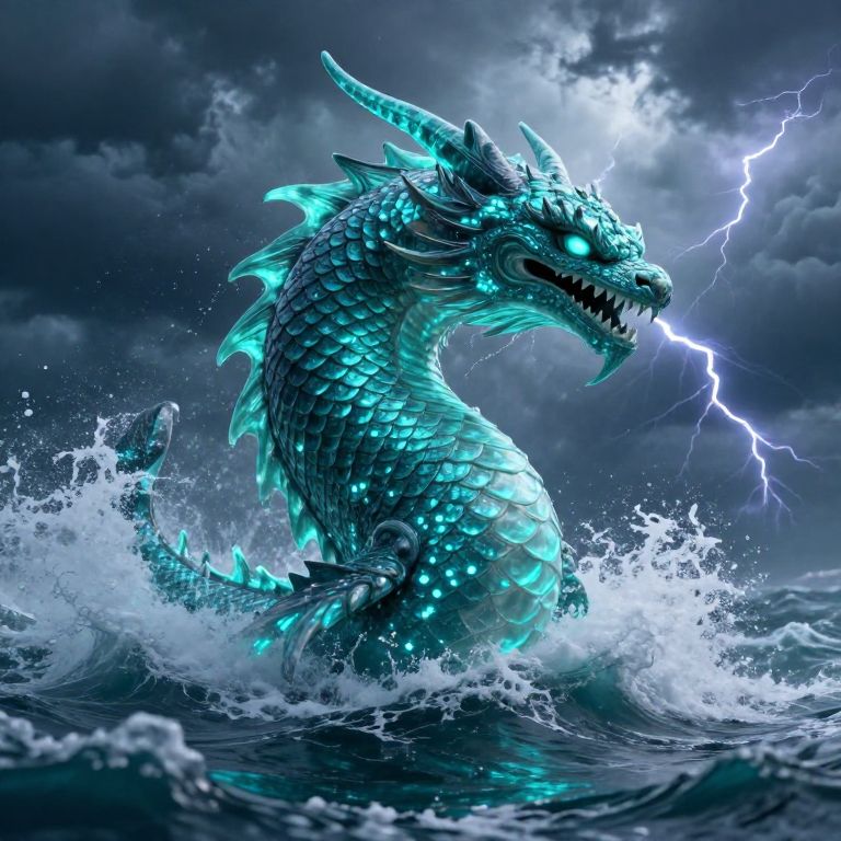 Digital artwork of a fierce, turquoise-scaled dragon with glowing blue accents emerging from turbulent ocean waves. The dragon's spiked back and head are illuminated by a bright, electrifying blue lightning bolt in a dark, stormy sky. Water splashes around its powerful, serpentine body, capturing motion and energy. The dragon's sharp teeth are bared, and its intense, glowing eyes focus forward. The overall scene is dynamic, with contrasting dark clouds and bright lightning highlighting the dragon's ethereal appearance. The art style is highly detailed and realistic fantasy.