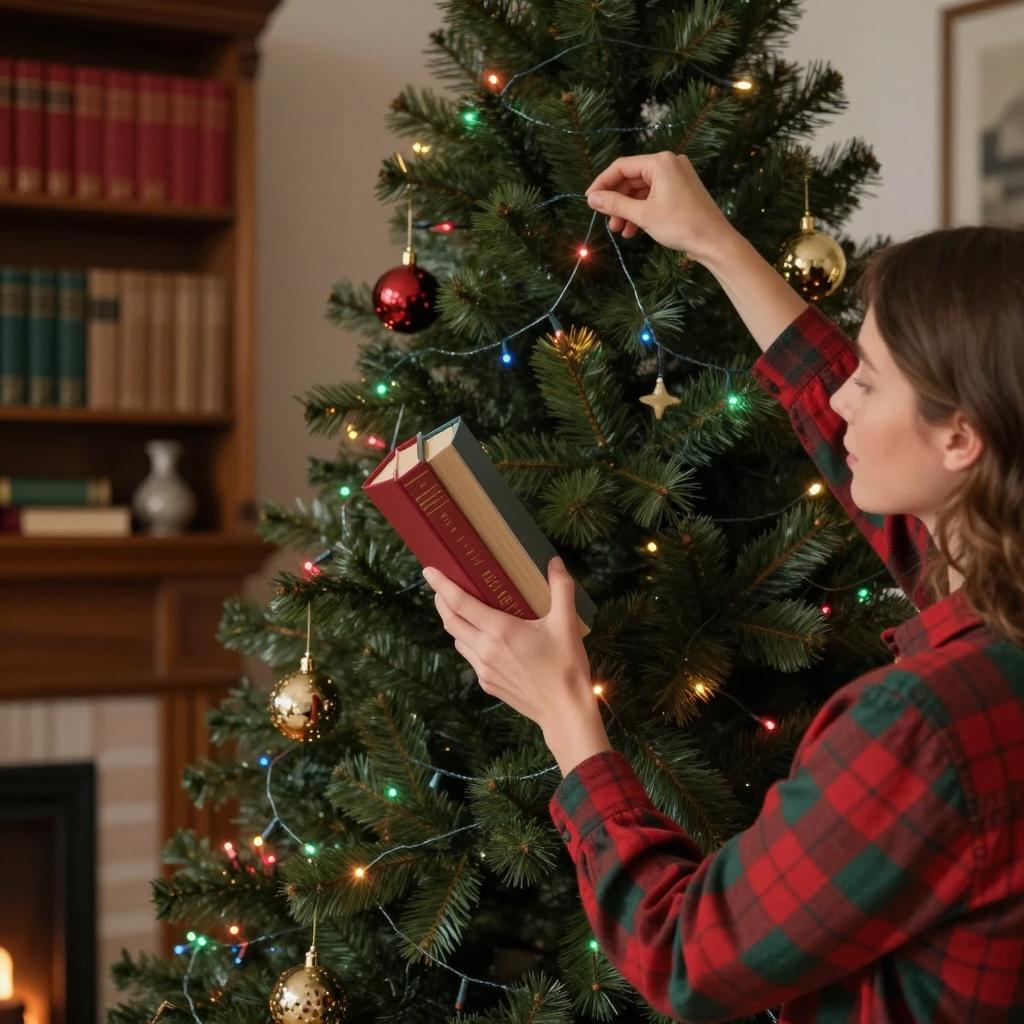 A young boy with light brown hair, wearing a red knit sweater and brown pants, stands near a decorated Christmas tree holding a letter. The Christmas tree is adorned with red and gold ornaments, lights, and a small white angel figure. In the background, a man wearing a black beret and gray sweater stands near a window with light curtains. The room features floral-patterned wallpaper and a wooden table.