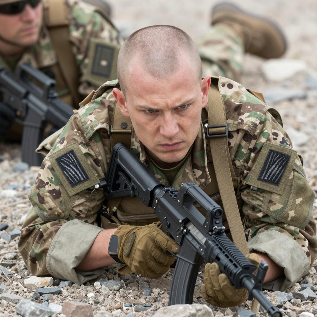 Close-up of a soldier with a shaved head and intense expression, dressed in camouflage uniform and tactical gloves, lying on rocky ground while holding a black rifle with a coiled cable. Another soldier is partially visible in the background, also wearing camouflage and tactical gear.