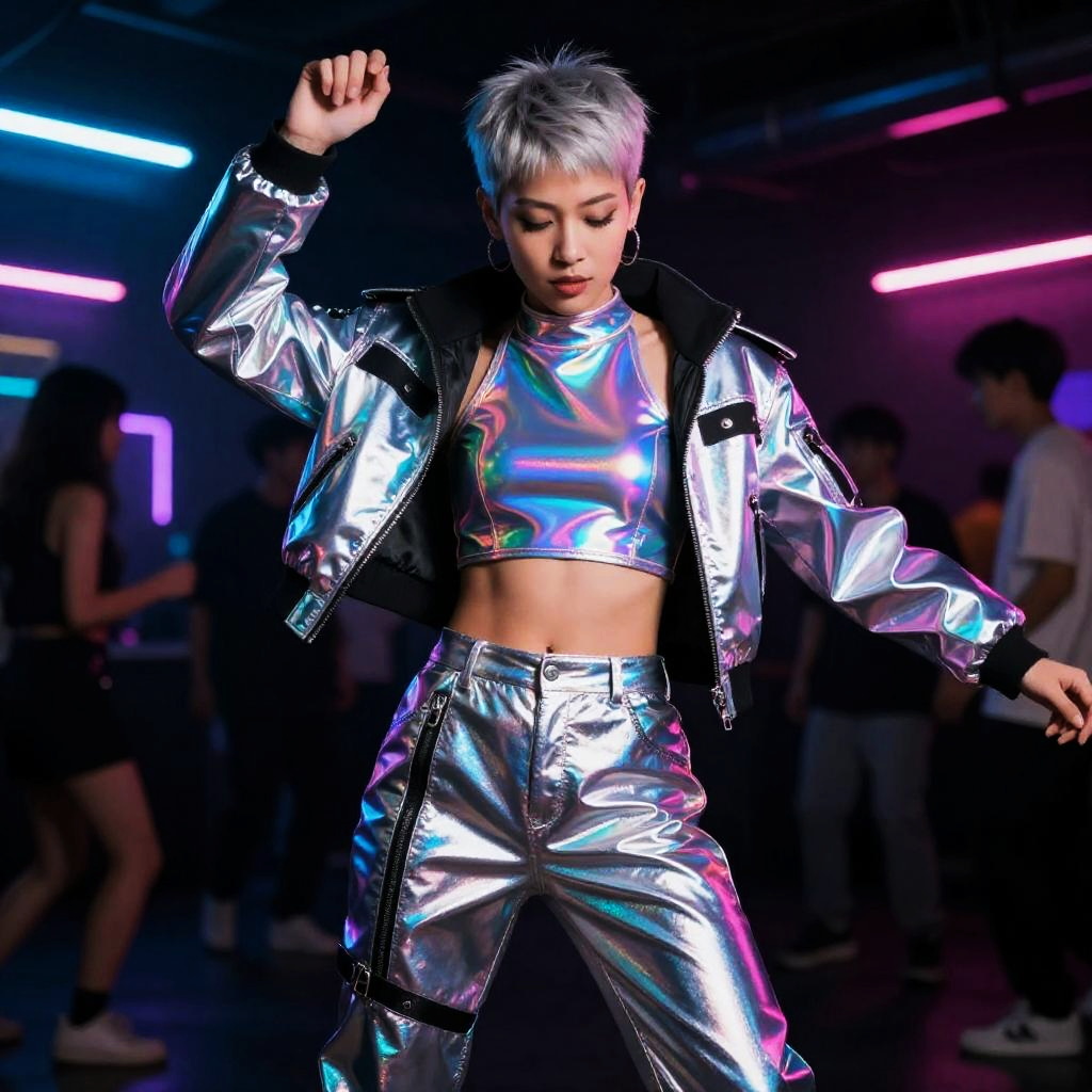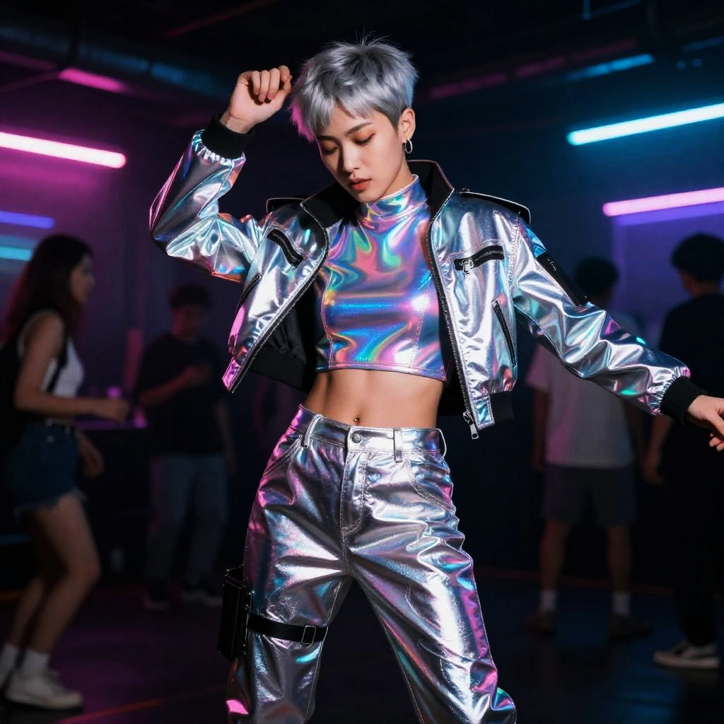 A 22-year-old non-binary person with silver pixie cut hairstyle dancing at an underground neon subway rave. They are wearing a reflective silver cyberpunk jacket, a holographic crop top, and high-waisted black techno trousers. The scene is illuminated by colorful neon lights with high contrast and vivid colors, capturing a futuristic rave atmosphere.