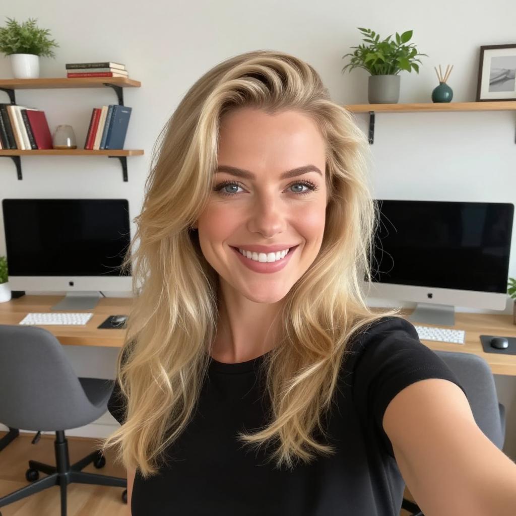 A blonde woman with wavy hair smiles warmly at the camera while taking a selfie in a modern home office setting. The background features a computer, shelves with books, plants, and decorative items, all contributing to a cozy and professional atmosphere.