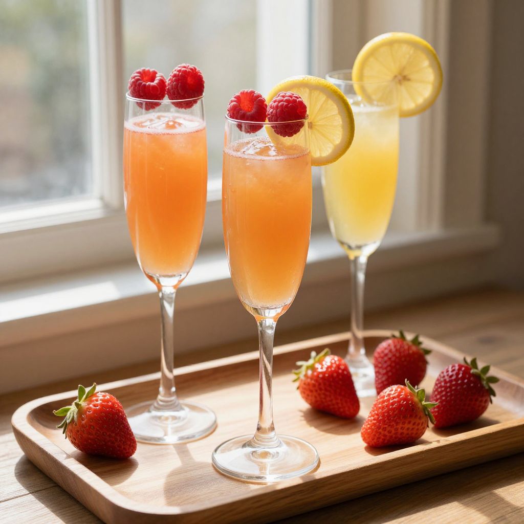 Two glasses of champagne sangria, adorned with vibrant berries and a slice of lemon, stand as a beacon of celebration and renewal, their effervescent glow inviting a moment of joyous escape amidst the warmth of sunlight and the subtle aroma of fresh strawberries.