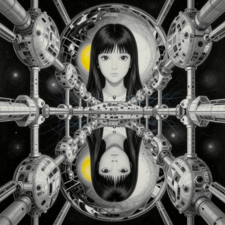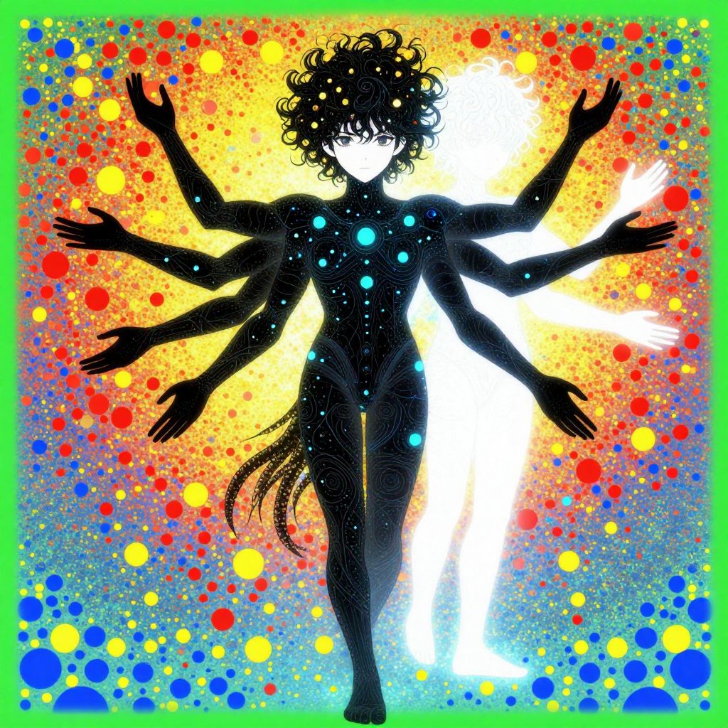 A surreal double exposure anime in ne0nfant4sy style featuring a human male figure with 6 arms, three on each side, in a powerful aura pose, embodying a state of enlightenment, The black body is intricately detailed with surreal dots and lines in black and neon blue, creating an ethereal, almost dreamlike texture, His face is a striking white, standing out against the intricate patterns of his dark body, He has curly hair adorned with golden attachments that shimmer subtly, The second exposure is a faint, glowing silhouette of the same figure, overlapping and creating a surreal blend of realities, The background is vibrant, filled with red and yellow dots, interspersed with blue dots, all encased by a green border, forming a radiant, otherworldly ground, This juxtaposition of colors and surreal elements emphasizes the figure's mystical aura