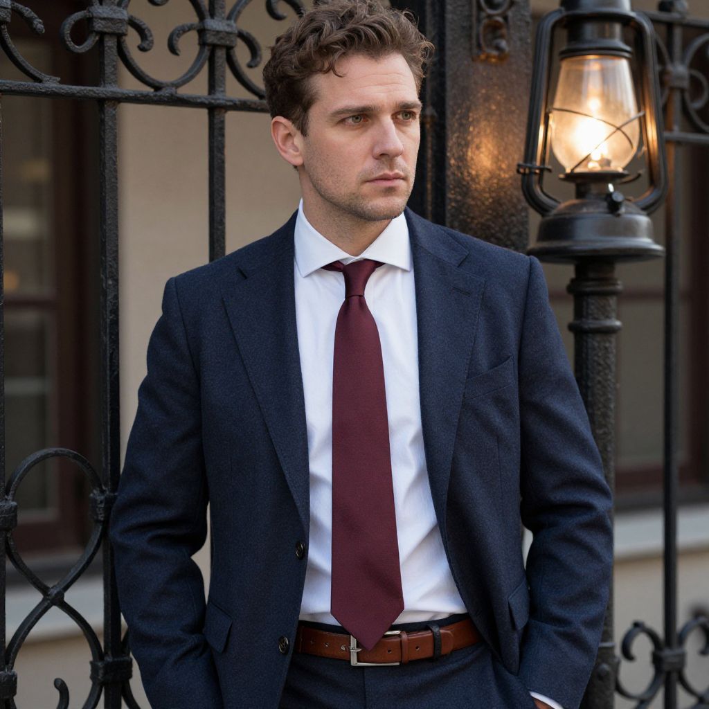 A man, navy wool suit, crisp white dress shirt, deep burgundy silk tie, brown leather monk strap shoes, matching brown leather belt, old-world charm, ornate ironwork, flickering gas lamps, pinhole camera style, contemplative expression Man has masculine face and piercing eyes