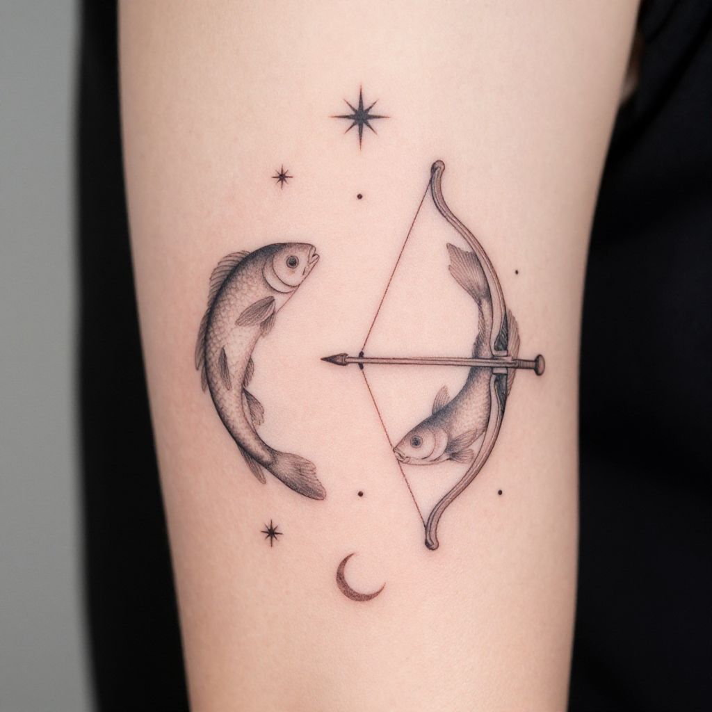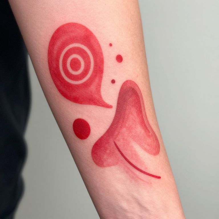 Red forearm tattoos combining modern abstract art and traditional symbolism, featuring spirals, dots, and organic shapes in vivid red tones, skin texture visible with natural imperfections, depicted in a high-resolution close-up with diffused natural light.