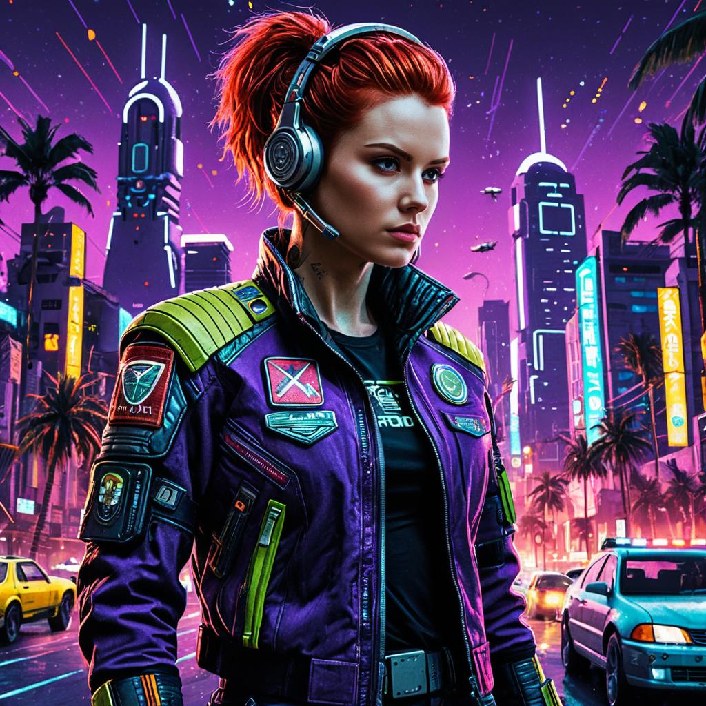 Retro-futuristic illustration of a determined android with red hair, wearing a rugged cycled Kevlar jacket adorned with patches and insignia. Background features a vibrant, dual-tone violet and chartreuse cityscape with futuristic buildings, vehicles, and palm trees, evoking a cyberpunk, dystopian atmosphere with neon lighting and gritty details.