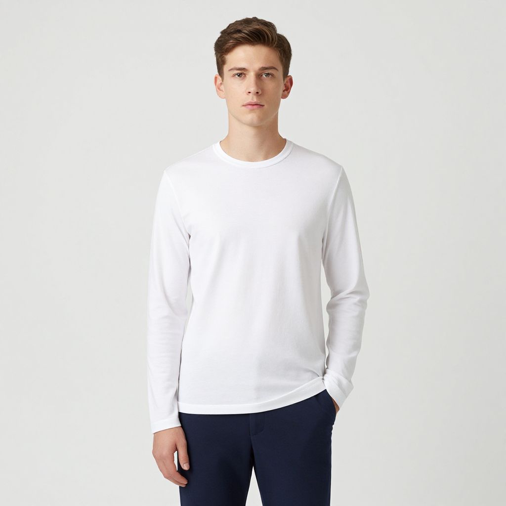 Photograph of a young man with short brown hair, wearing a plain white long-sleeve shirt and black pants, standing against a plain white background