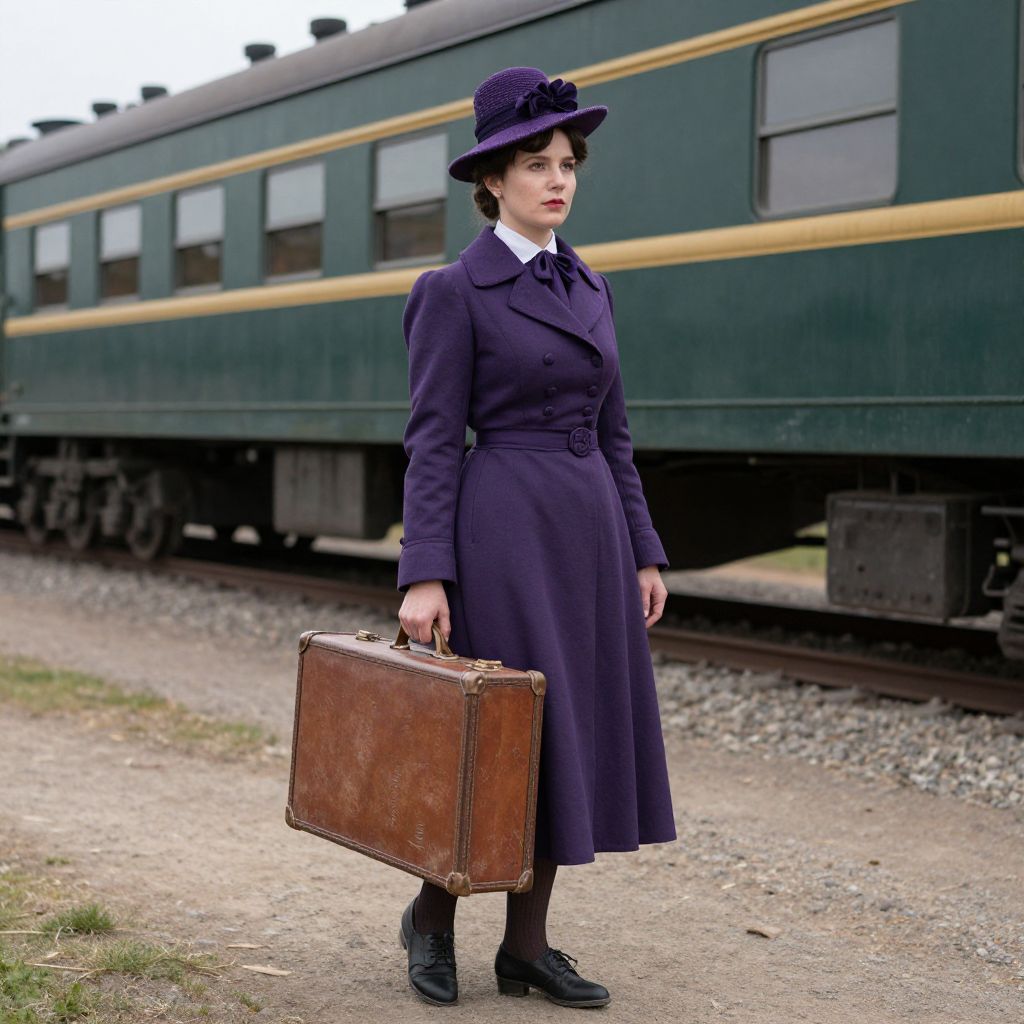 A woman in a 19th-century outfit, wearing a purple hat and coat, stands outside a train, carrying a trolley case, with the Atchison Topeka Santa Fe Railroad in the background.