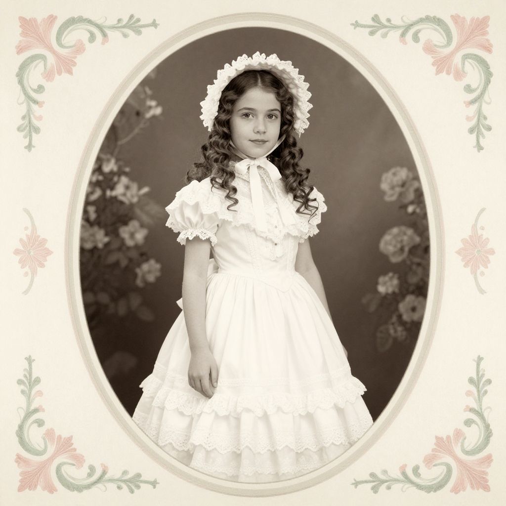 A vintage-style sepia photograph of a young girl dressed in a detailed Victorian white dress with lace and ruffles. The girl has long curly hair and wears a matching bonnet. She poses gracefully in front of a floral backdrop within an ornate oval frame with pink and green decorative borders.