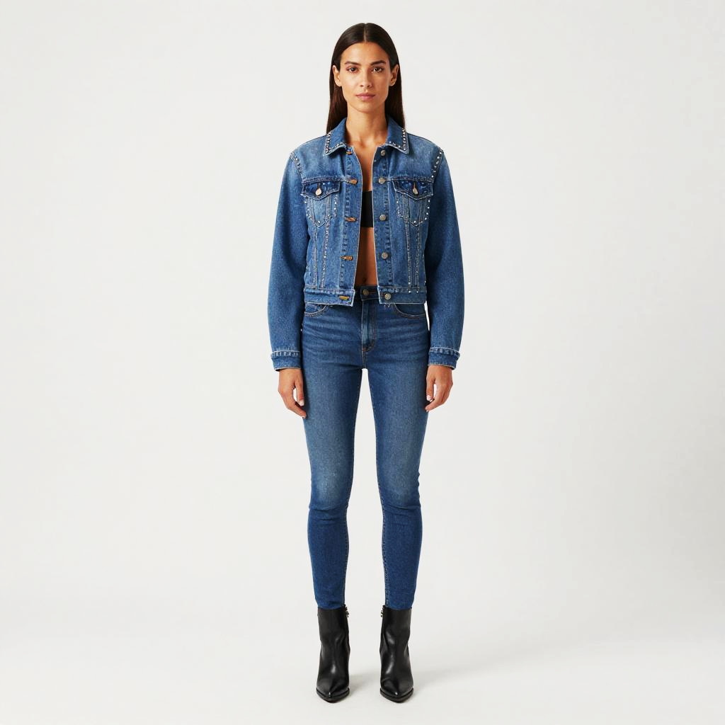 Young woman, asymmetrical bob, petite build, denim on denim outfit, classic double denim style, denim bustier top, fitted studded denim jacket, skinny mid-rise jeans, sleek leather boots, choker necklace, Chic, modern, bold