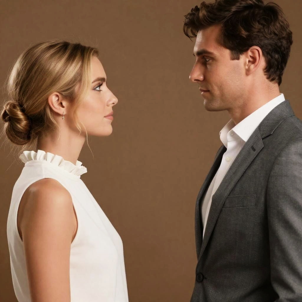 Photograph of a couple in an intimate moment. Blonde woman with wavy hair, wearing a black sequined dress, tilts head back, eyes closed, smiling. Man with short brown hair, wearing a blue sweater, leans in, eyes focused on her, about to kiss. Woman's right hand on man's back, man's left hand on her waist. Warm wooden background. Soft, romantic lighting. Both smiling, anticipating kiss.
