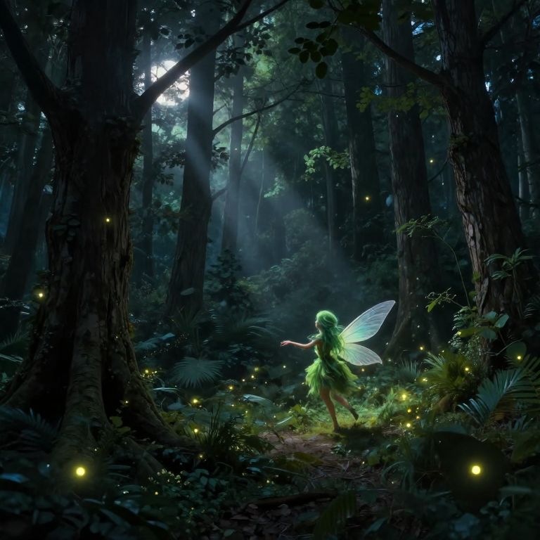 A whimsical forest scene is captured from an enchanting bug's-eye view, reminiscent of Brian Froud-inspired fantasy illustrations. A delicate fairy with iridescent wings and a shimmering silver gown hovers above a tapestry of lush, vibrant flowers, each petal intricately detailed and reflecting the ethereal light of the enchanted woodland. The surrounding trees tower like ancient guardians, their gnarled branches weaving together to form a living canopy that filters dappled sunlight onto the forest floor below, evoking a sense of magic, wonder, and serenity in equal measure as it captures the timeless beauty of this mystical realm.