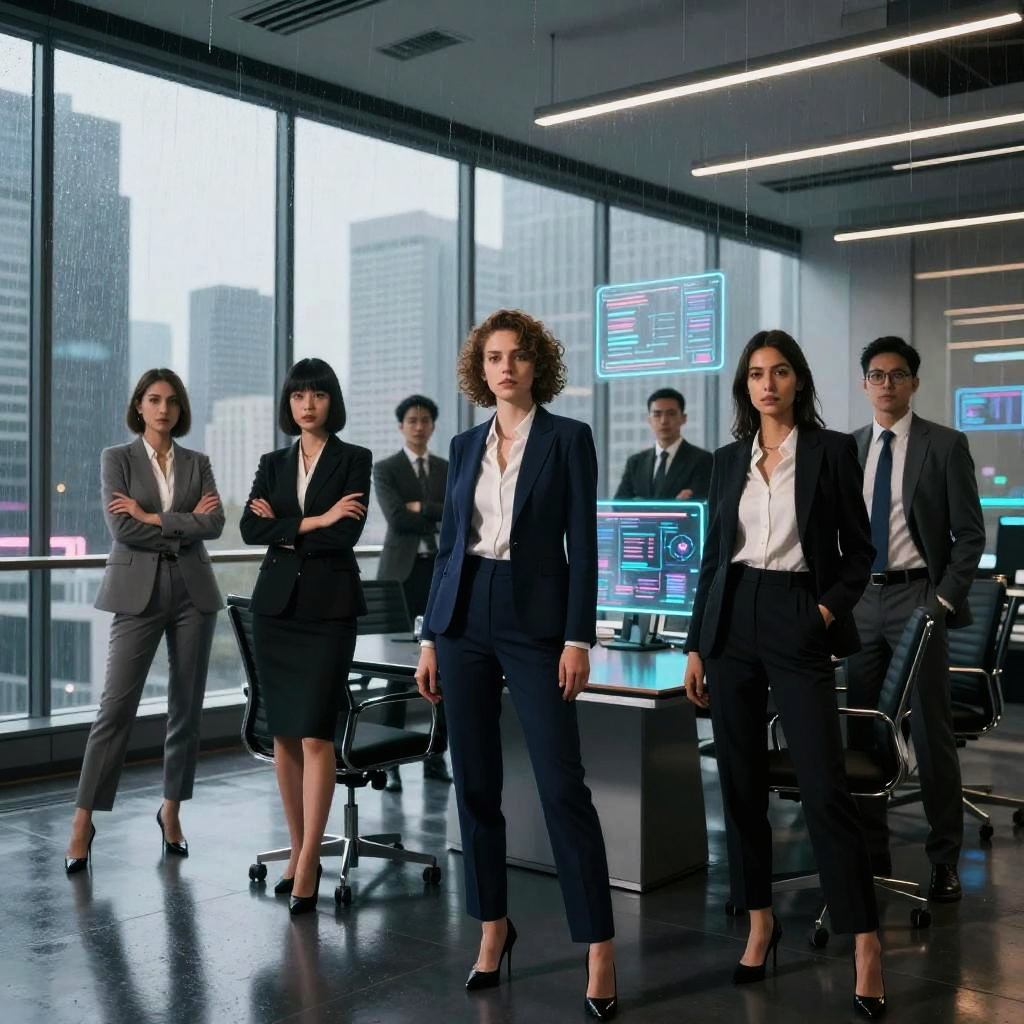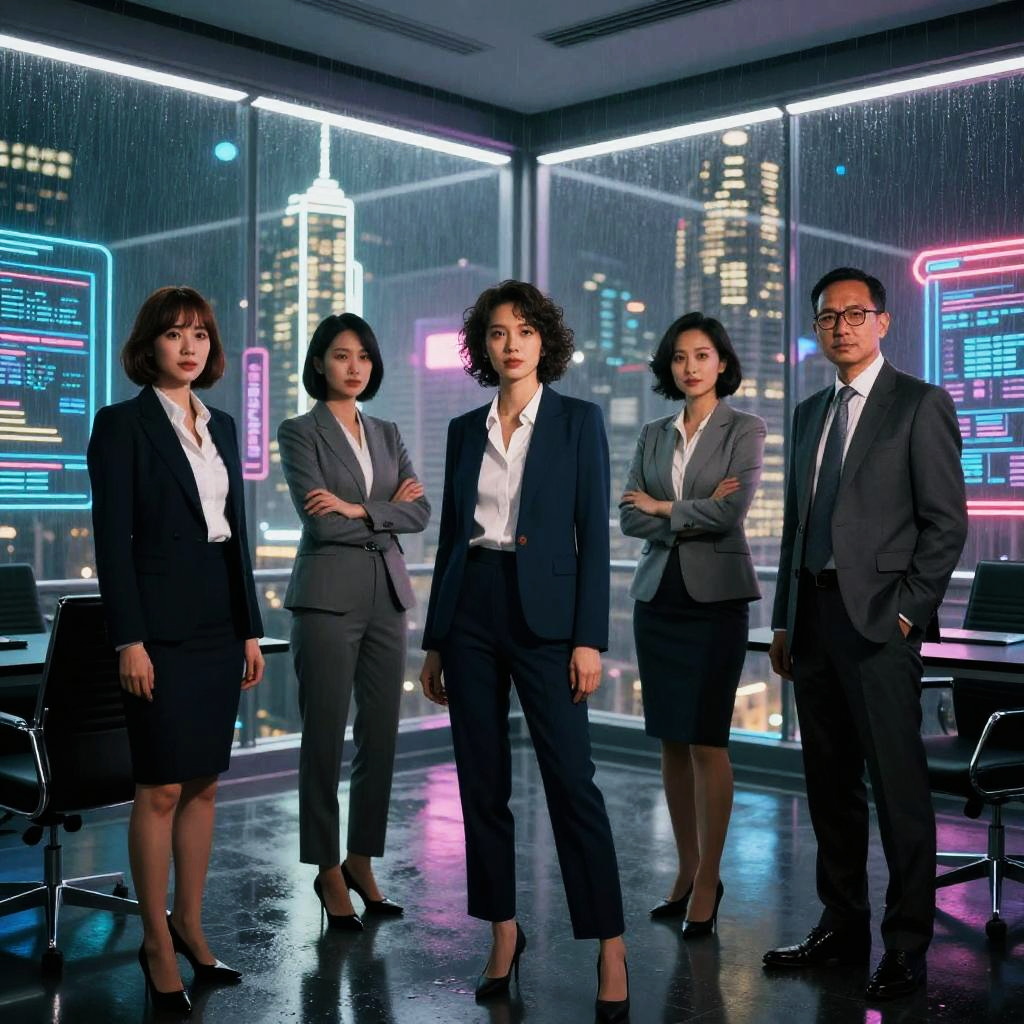 Ultra-stylized watercolor cyberpunk portrait of a young man in a formal black suit and tie standing confidently in a neon-lit urban alleyway. The scene includes futuristic holographic dashboards, phosphorescent graffiti, reflective chrome surfaces, and atmospheric fog. Accompanied by robotic and casually dressed figures, the image features high contrast lighting, rim light effects, and a dramatic, futuristic corporate aesthetic.