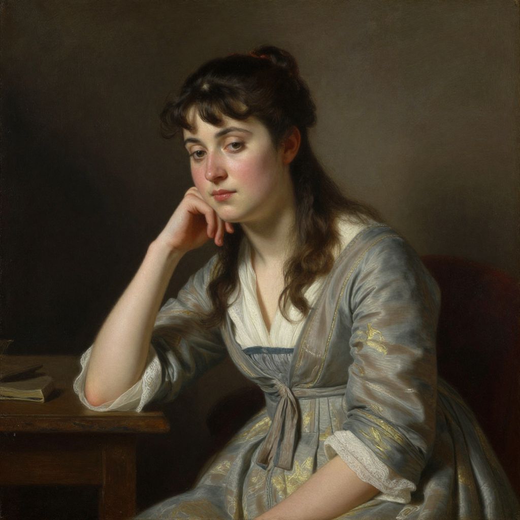 This is a digital painting of a young woman with fair skin and dark brown hair, styled with bangs and a slight wave. She is seated, leaning her head on her right hand, with a contemplative expression. She wears a blue, long-sleeved dress with white lace trim and a black ribbon at the neckline. The background is dark and muted, highlighting the subject. Her left arm rests on a wooden surface, on which a small, closed book is visible. The lighting casts soft shadows, emphasizing her delicate features and the texture of her dress. The overall style is realistic with a classical, 19th-century portrait influence.