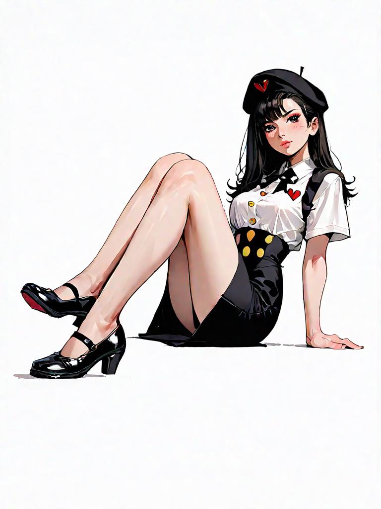 1girl, source_comics, realistic face, full body shot, Woman, retro-inspired, black A-line mini dress with short sleeves, round neckline, front button closure with large white buttons, fitted waist, flap pockets at the hips, black flat shoes with pointed toes, black beret, white background.