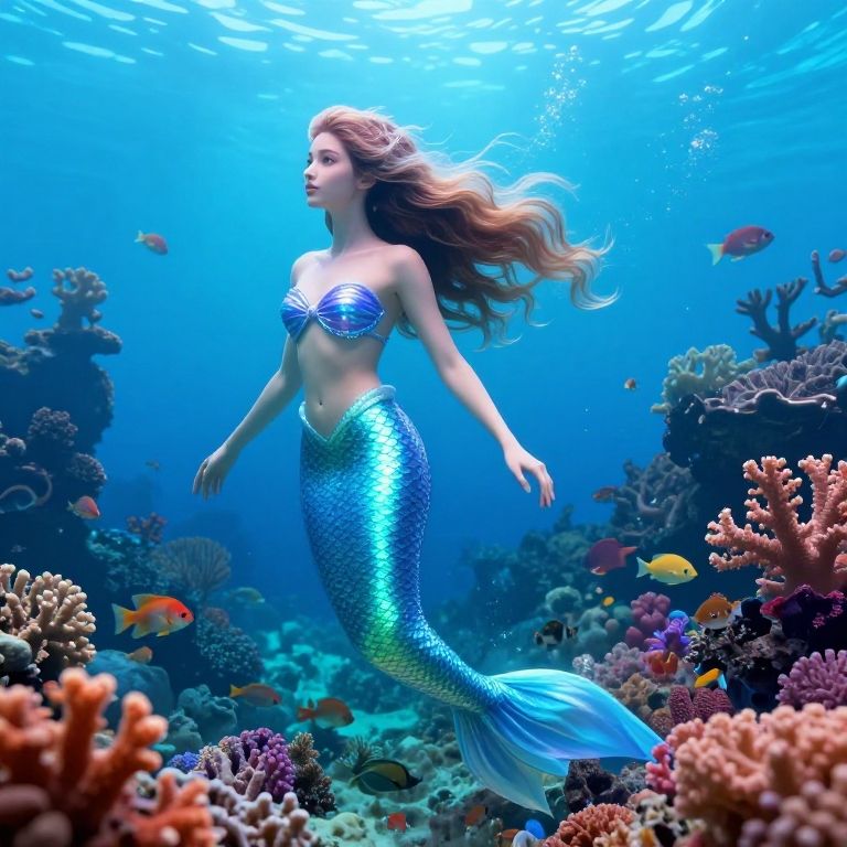 Piona, a serene underwater mermaid queen with flowing hair and shimmering scales, surrounded by coral reefs and exotic sea creatures, bright aquatic colors, fantasy realism