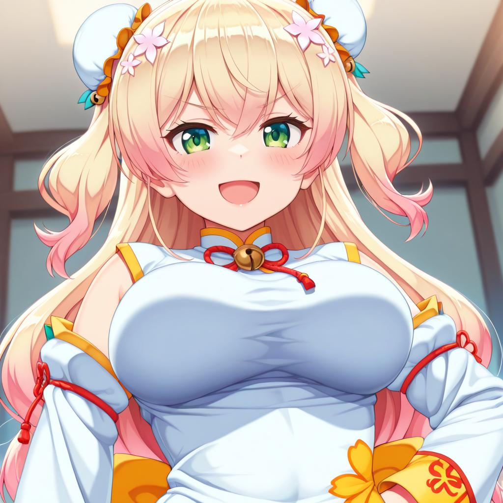 Momosuzu nene (old design), hololive, 1girl, fang, green eyes, hair between eyes, blonde hair, long hair, gradient hair, pink hair, double bun, two side up, hair flower, bun cover, medium breasts, large breasts, chinese clothes, chinese clothes, detached sleeves, juliet sleeves, virtual youtuber, virtual youtuber, jingle bell, by artist tachimi (basue), illustrious