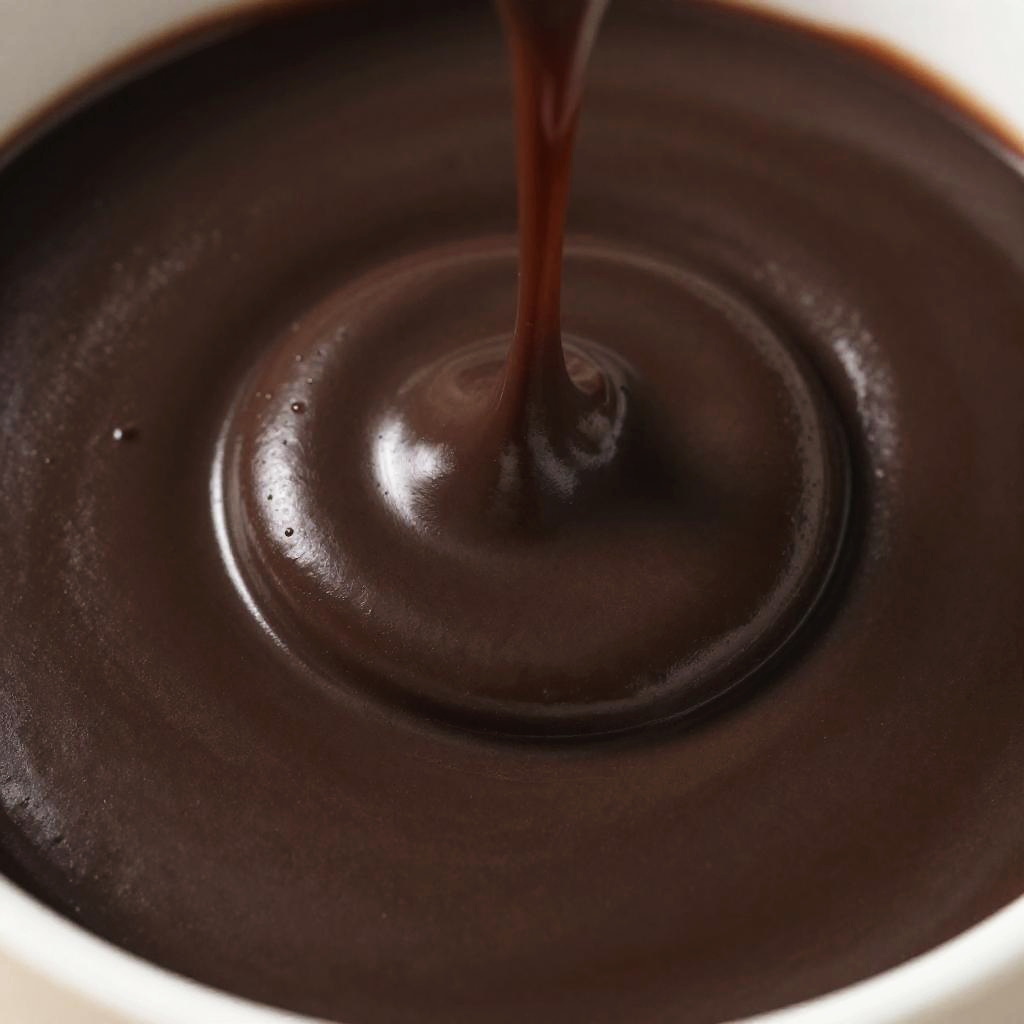 Close-up of thick ebony cream being spread on a dessert, silky smooth texture with glossy sheen, rich dark brown hues, vibrant food styling under soft diffused light