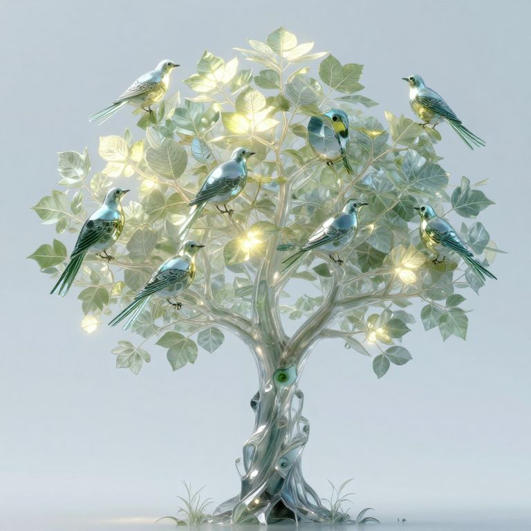 Photograph of a decorative, illuminated tree with six small, green and blue feathered birds perched on its branches. The tree has translucent, white leaves that glow softly, emitting a warm yellow light. The birds, detailed with black and yellow accents, are positioned on different branches. The tree's trunk is twisted and glass-like, adding a delicate, ethereal quality. The background is a clean, bright white, emphasizing the tree's glowing light and the birds' vibrant colors. The overall style is whimsical and festive, creating a magical, serene atmosphere.