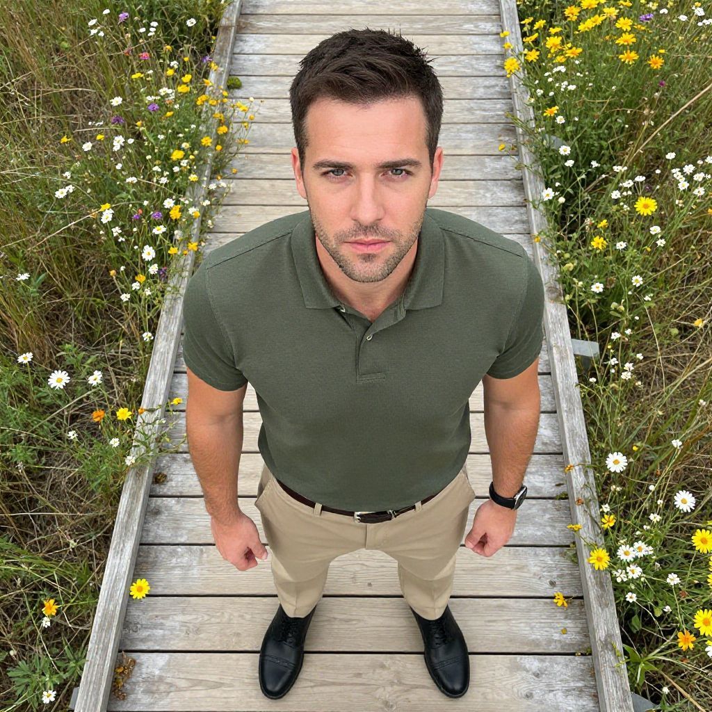 A man, olive green polo shirt, khaki dress pants, black oxford shoes, standing on a wooden boardwalk, vibrant wildflowers surrounding, overhead shot, relaxed expression, sunlight filtering through the flowers. Man has masculine face and piercing eyes
