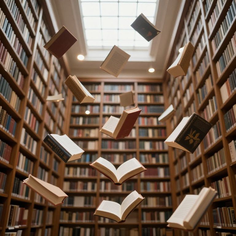 Gravity-defying books hover freely in a void above a library ceiling, floating slowly into the hands of readers from all dimensions.