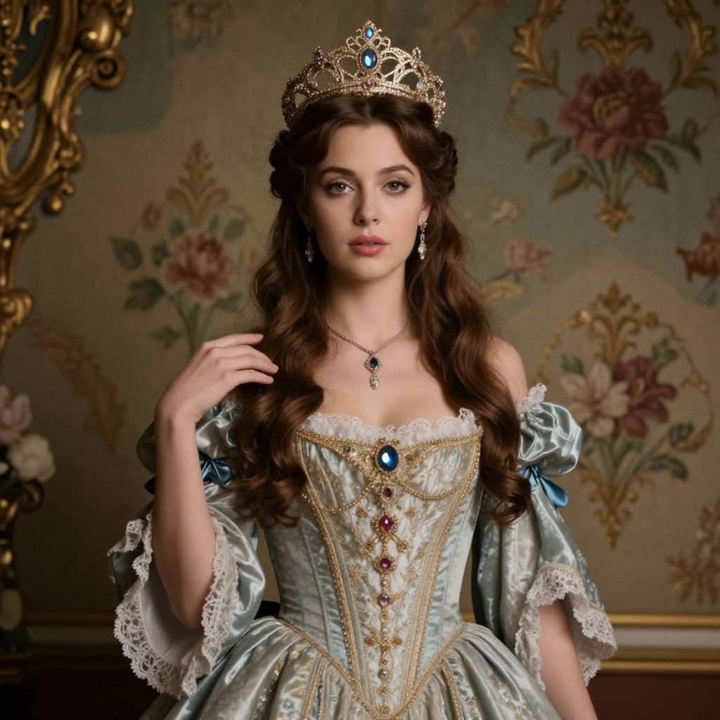 Photograph of a fair-skinned woman with long, wavy brown hair adorned in an ornate gold crown. She wears an elaborate, Victorian-style, light blue satin gown with white lace trim, gold embroidery, and a central blue jewel. Her dress features puffed sleeves and a corset-like bodice. She has a delicate necklace with a matching blue jewel and earrings. The background is a vintage, floral-patterned wallpaper with gold accents, adding an opulent feel. Her expression is serene, with soft makeup highlighting her features. The overall style is regal and elegant, reminiscent of a fairy tale princess.