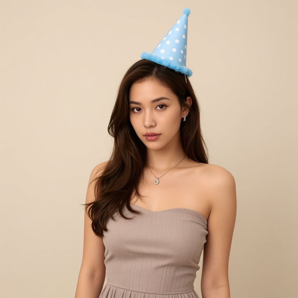 Photograph of an Asian woman with long, wavy black hair and fair skin, wearing a light blue, polka-dotted party hat and a strapless, beige ribbed dress. She has subtle makeup, including pink lipstick, and is wearing small, silver hoop earrings and a delicate silver necklace with a small pendant. The background is a plain, light beige wall. She stands facing the camera with a neutral expression. The image has a soft, slightly over-exposed lighting, giving it a gentle, warm feel.