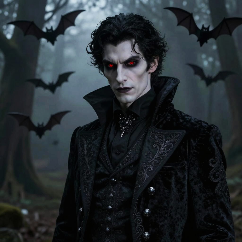 Vampire pale skin portrait, glowing red eyes, sharp fangs, gothic Victorian attire, misty moonlit forest background, eerie atmosphere, cinematic lighting, high detail