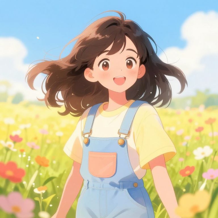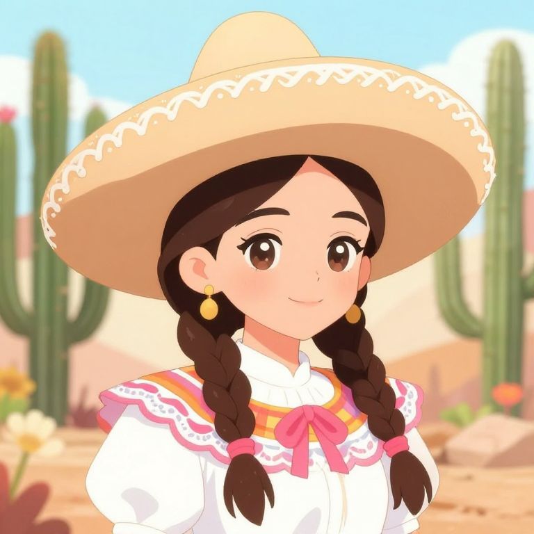 Cute Mexican anime girl with braided hair and a wide-brimmed sombrero, wearing a modern interpretation of folkloric dress, soft pastel colors, large sparkling eyes, smiling gently, background of blooming cacti and desert flowers, anime-style illustration.