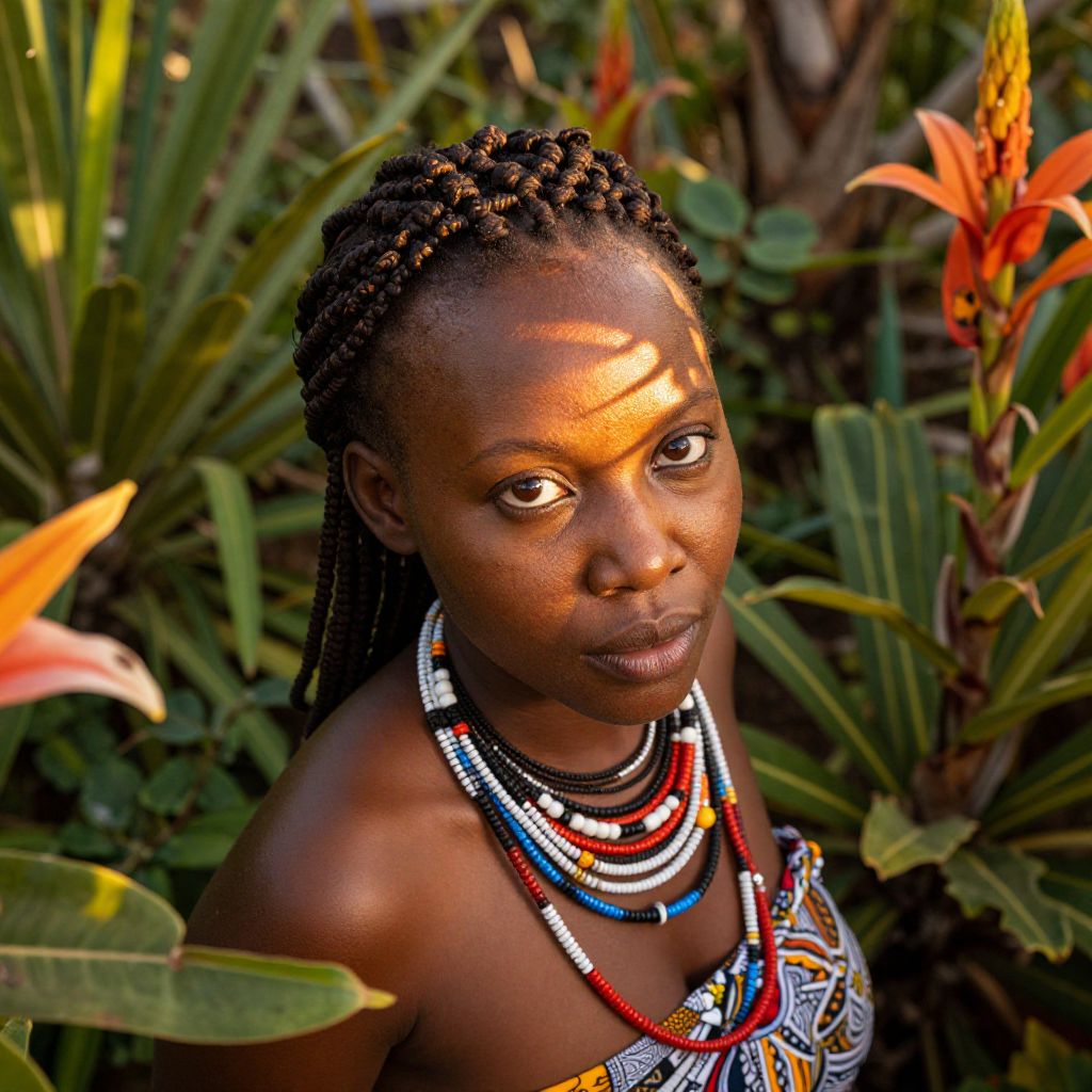 Imagine a serene African woman with warm honey skin and soulful brown eyes, her hair intricately braided in a rich cultural style. Viewed from an elevated eye-level perspective, she stands amidst lush tropical flora, vibrant flowers framing her figure with verdant foliage. Soft golden light filters through the canopy above, casting dappled shadows on her face, emphasizing her skin's texture and the subtle details of her traditional attire adorned with colorful beaded accessories. This portrait captures a harmonious blend of nature and humanity, showcasing her quiet strength and grace against the backdrop of a vibrant natural wonderland.