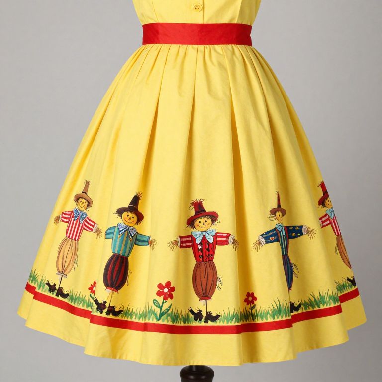 Vintage novelty print dress featuring a 1950s Mr. and Mrs. Scarecrow border design, crafted in vibrant yellow cotton with red trim accents, showcasing a playful and nostalgic aesthetic.